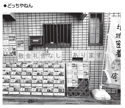 近づいてみると、貼り紙の下に大きなパネルが二枚あり、たくさんの物件情報が載っています。「敷金礼金なし」と「あります」の間は一角(紙一枚ぶん)空いているので、左のパネルが「なし」物件コーナー、右のパネルが「あり」物件コーナーなのかもしれません。もしくは「敷金礼金なし」の物件が「あります」という意味かもしれません。