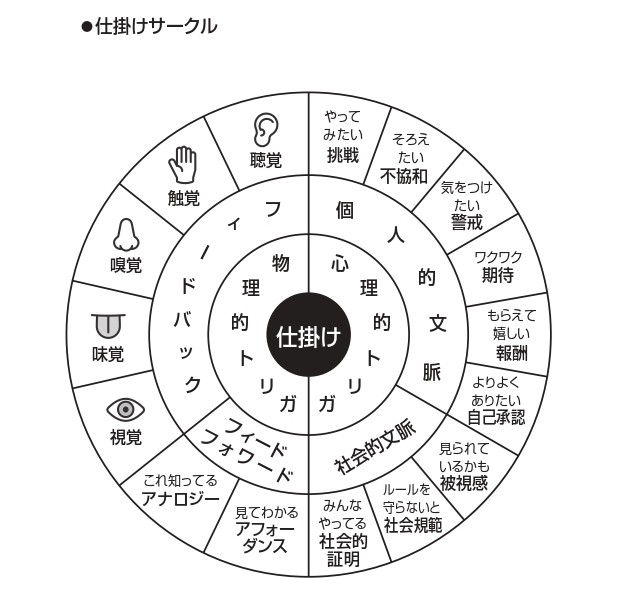 仕掛けサークルに照らし合わせながら見てみましょう。仕掛けの要件を満たし、ほぼ仕掛けとして成立しているものもあれば、もうひと息で仕掛けになりそうなものもあります。仕掛けのタネをたくさん集めておくことで仕掛けのセンスを養い、新しいアイデアに応用することができます。