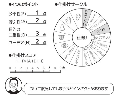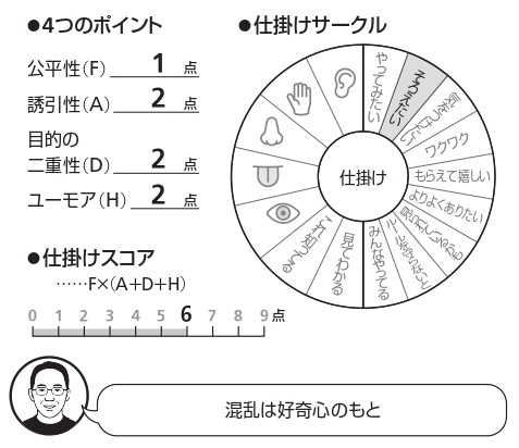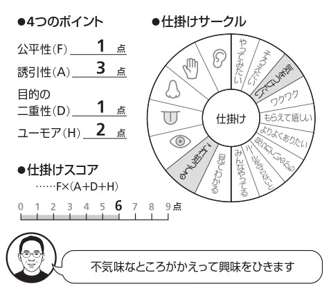 まず、仕掛けを評価するためにFAD要件[公平性(F)、誘引性(A)、目的の二重性(D)]にユーモア(H)を加えた4つのポイントでスコアリングを行います。