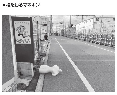 服をまとっていないマネキンは不気味です。首や腕が欠けた人体の形に加え、道ばたに横たわっていることで心理的なインパクトが大きく、ドキッとさせられます。