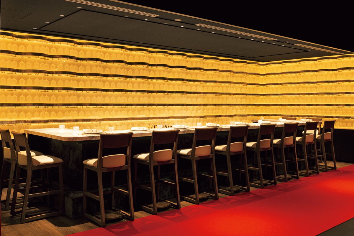 周囲を緑が覆う、まるで森の中の隠れ家のような建物のエントランスの扉を開けると、目に飛びこむのがワイングラスで装飾された圧巻のシャンデリア。そのシャンデリアを囲む壁と床に映しだされるのは、ブルゴーニュの地だ。アペリティフとアミューズブッシュをいただきながら、葡萄畑を眺め、グラン・クリュ街道を歩き、ロマネ・コンティやルロワ、エマニュエル・ルジェら生産者を訪ねる。それはまさしく五感で味わうブルゴーニュの旅。