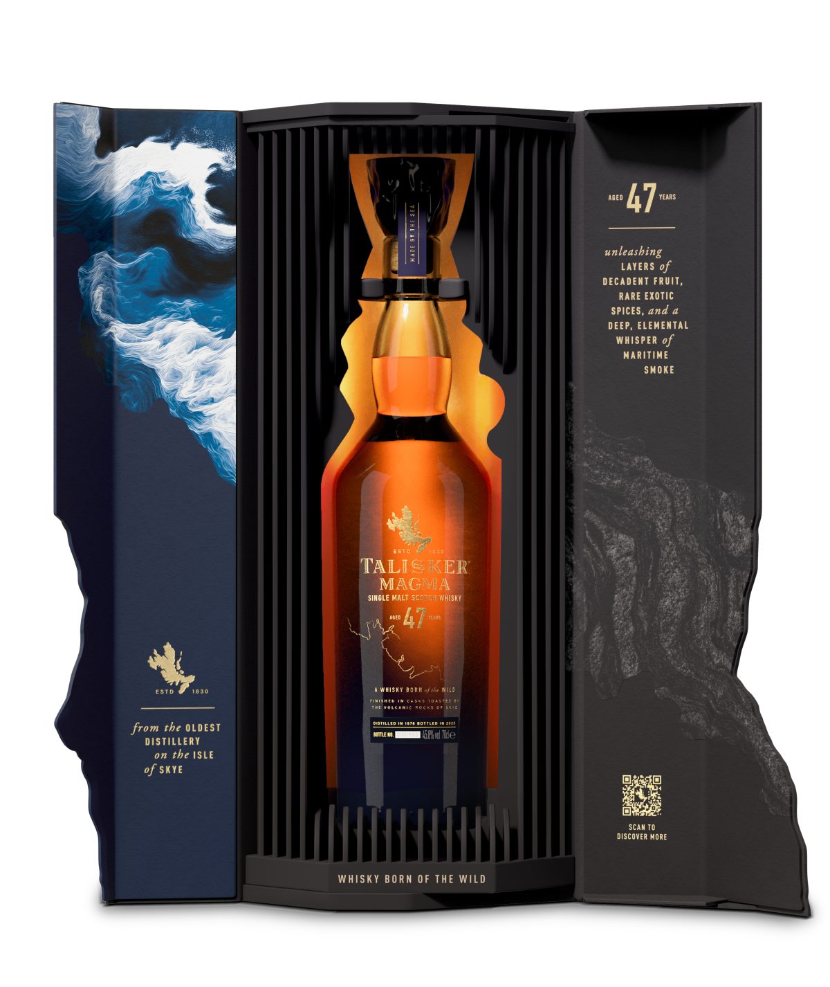 荒々しい海と険しい地形に囲まれたスカイ島に位置する、タリスカー蒸溜所。その壮大な自然を映し出す味わいは、潮風を思わせるミネラルと黒胡椒のスパイスを特徴とし、「MADE BY THE SEA」の哲学を体現してきた。「タリスカー 47年 マグマ」は、その土地の成り立ちそのものを着想源とする特別なウイスキーだ。