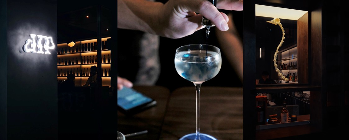 店名のdipは、客家の伝統工芸である藍染(インディゴ染め)の工程に由来する。素材を浸し、色や成分を抽出するプロセスを、カクテルにおける浸漬・抽出・発酵などの技法に重ねたものだ。