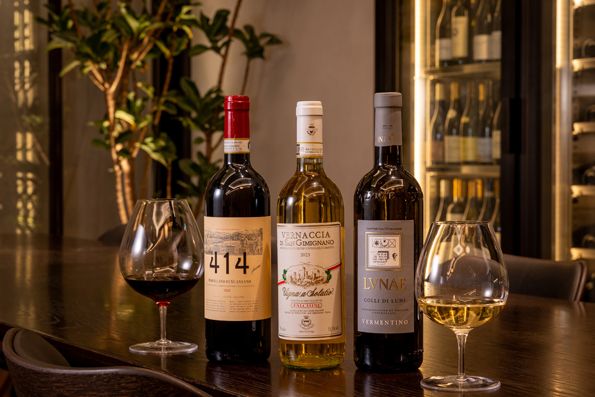 この旅(コース料理)をより立体的にするのが、エグゼクティブ ソムリエ森覚氏によるワインペアリングだ。第2章では、リグーリア州の「エチケッタ グリージャ コッリ ディ ルーニ ヴェルメンティーノ」、トスカーナ州の「ヴェルナッチャ ディ サンジミニャーノ ソラティオ」、そして「モレッリーノ ディ スカンサーノ ポデーレ414」など、各州にゆかりのあるワインを含む6種を用意。料理が土地の表情を描くなら、ワインはその空気を吹き込む存在。香り、余韻、温度感まで含めて、州ごとの個性を体感できる。
