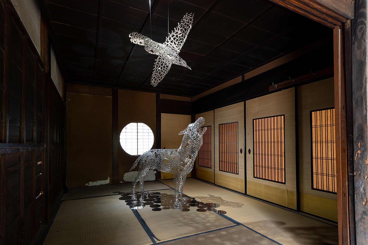 続いて、「西川庄六別邸」へ。入ってすぐの空間を彩る、西島雄志氏の作品「シンクロ(2025年)」に見惚れる。ニホンオオカミが神格化した「真神(まかみ)」は真実を見極める神。オオカミの遠吠えには、自分の存在を知らせる意味があるそう。実は10月13日まで群馬県中之条町で開催されていた中之条ビエンナーレでも、西島氏の作品が展示されていて、八咫烏(やたがらす)により導かれるシンクロした世界が表現され、時空を超えた3つの作品が繋げられたものだという。「オオカミを完全な形にしないことで、気配を表現したかった」とは西島氏。