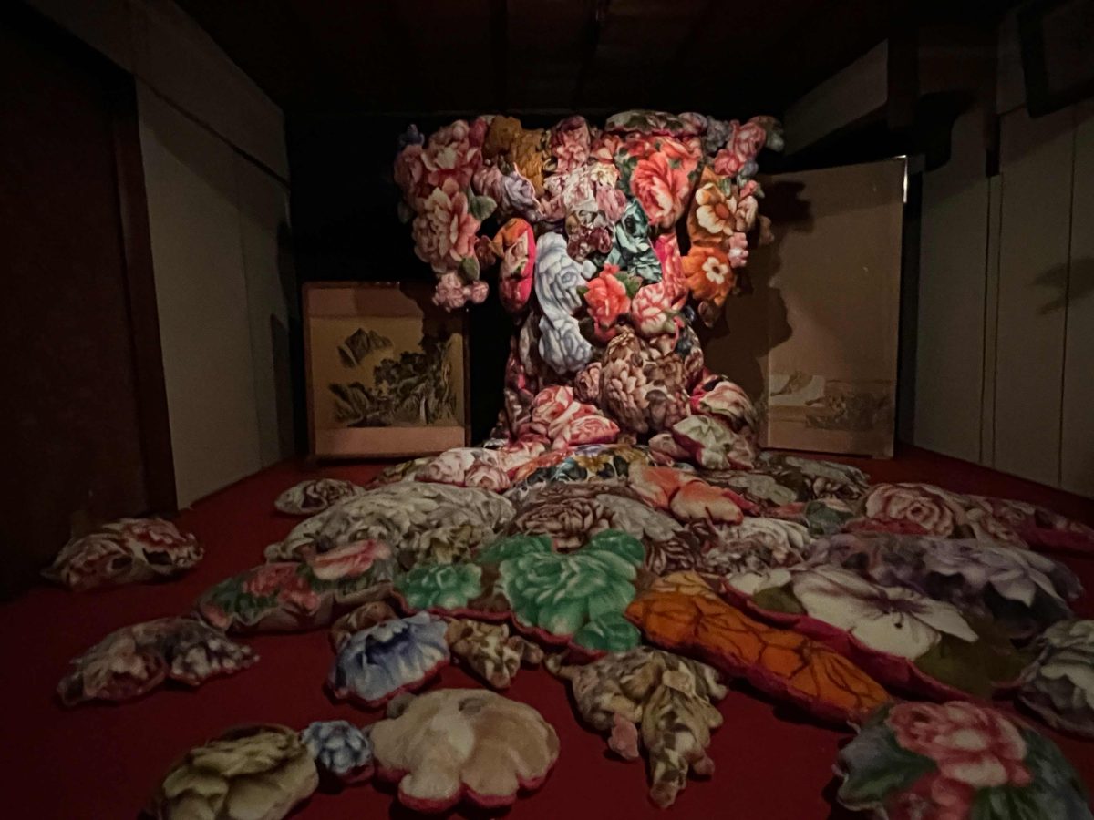 さらに奥の部屋に進むと、おどろおどろしい雰囲気が漂う江頭誠氏の「毛布製薔薇柄袷着物(2022年)」が。昭和の時代、どこの家にもあった花柄の毛布が切り取られ、着物のような姿に変容。本来、花柄は明るい気持ちにさせてくれるものでありながら、見せ方次第で怖いイメージにもなるというギャップを目の当たりに。