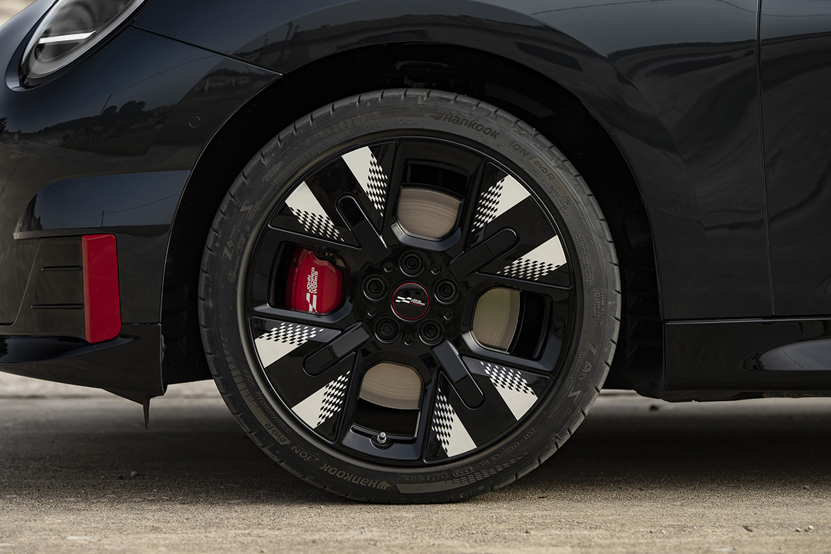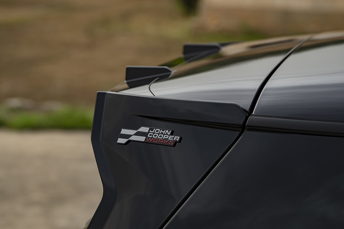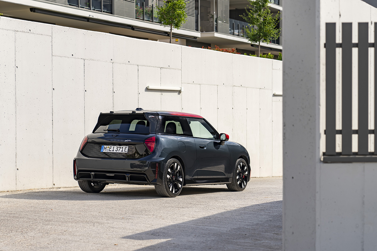 EVにとって重要な鍵となるのが空力性能。JCW Eではフロントグリルとアンダーボディをフラットに、リアには大型のディフューザーを装備して空気抵抗を低減。専用のフロントバンパーとリアスポイラーがダウンフォースを発生し、コーナリング時などに車体を路面におしつけて挙動を安定させる。