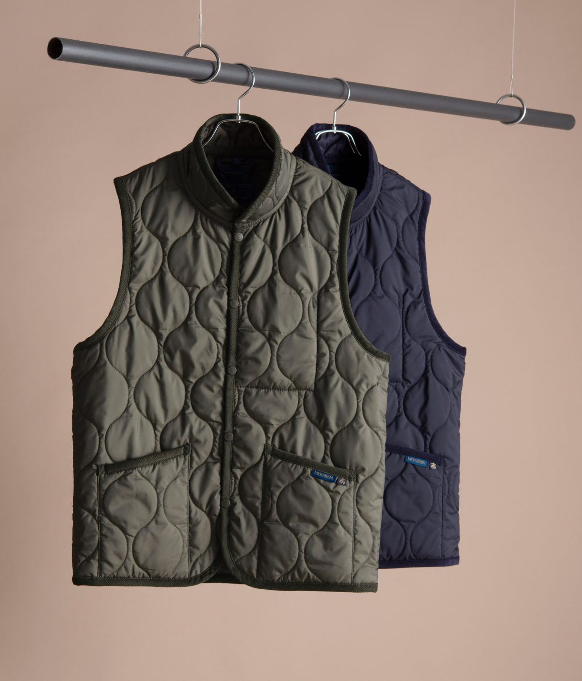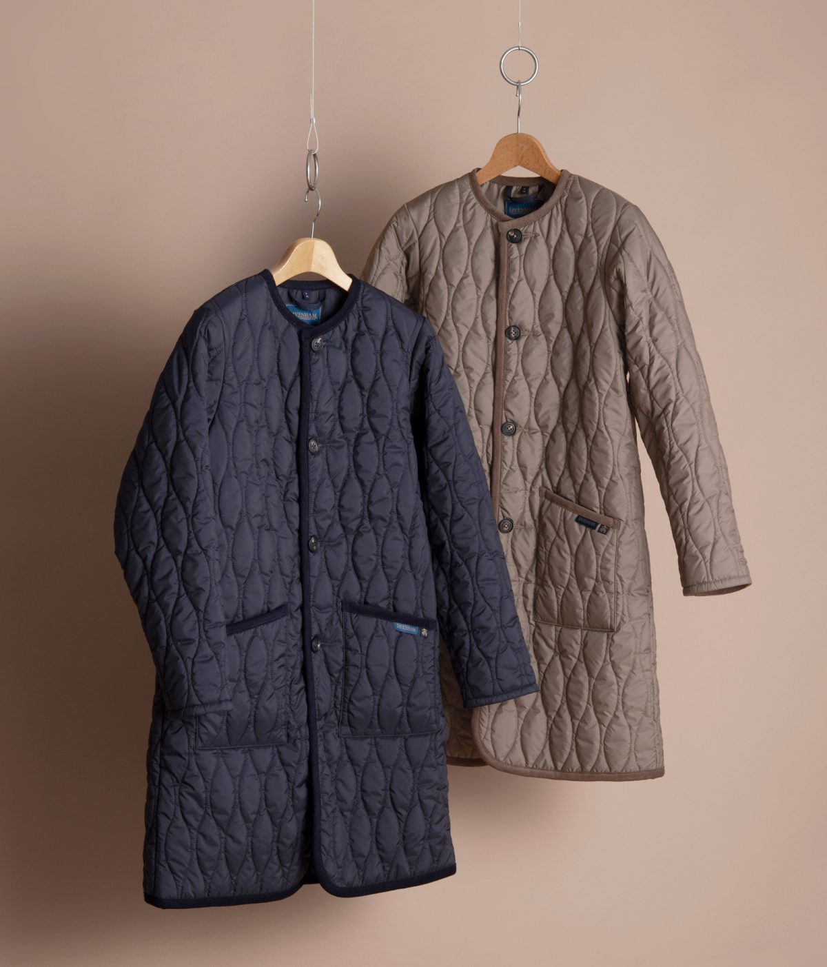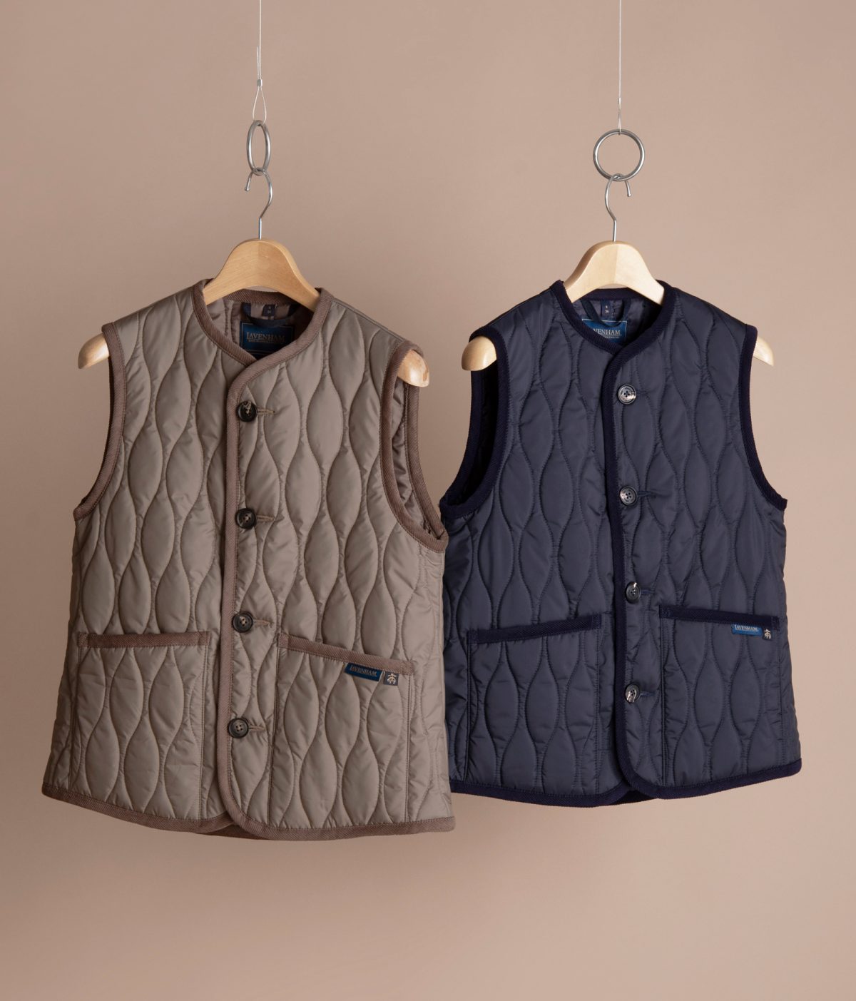もう一型は、ラベンハムの定番「ソーンハム」をベースにしたウィメンズのノーカラーベスト。リサイクル素材「ラブンスター」とオーガニックコットンのバインディングを組み合わせ、環境配慮とクラフトマンシップを両立。細やかなナローオニオンキルトが、シンプルながら奥行きのある表情を生み出している。