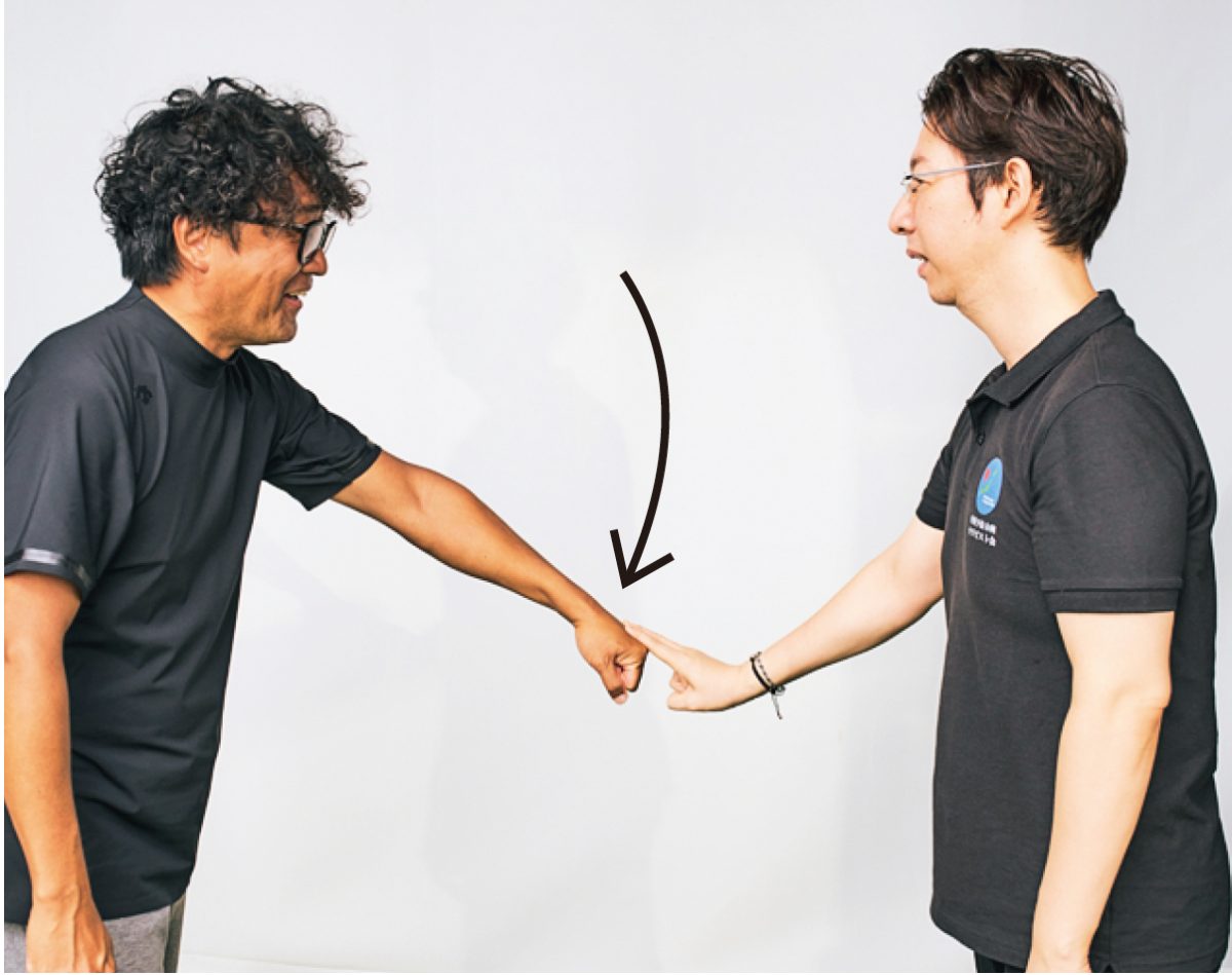 「肘を伸ばした状態だと持ち続けられる時間はわずか。長く持ち続けるには自然と肘が内側に絞られた状態になるはず。肘は身体に近い状態が正常位置だとわかります」