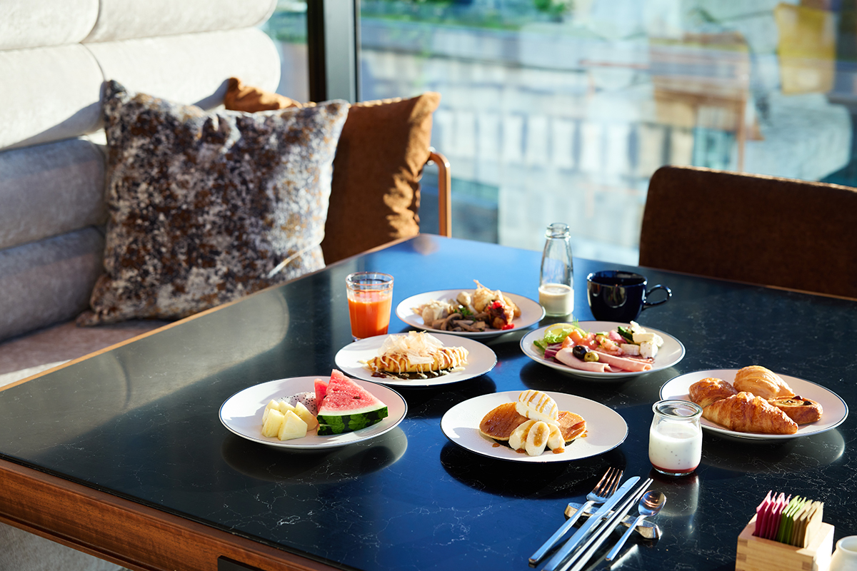 テーブルオーダーでは「オムレツ」「あんかけ牛すじオムレツ」「フレンチトースト、マンゴー、シナモン」「鶏出汁ラーメン」の中から1品選ぶスタイル。セレクトしたのは「鶏出汁ラーメン」。朝ラーという背徳感もあるものの、胃に染み渡る優しい味わい。そしてお楽しみのビュッフェでは、大阪名物のたこ焼きや串カツなども揃えつつ、多種多様なサラダやパンなど和洋ともに取り揃えてあり、連泊でも楽しみ尽くせる豊富なラインナップだ。