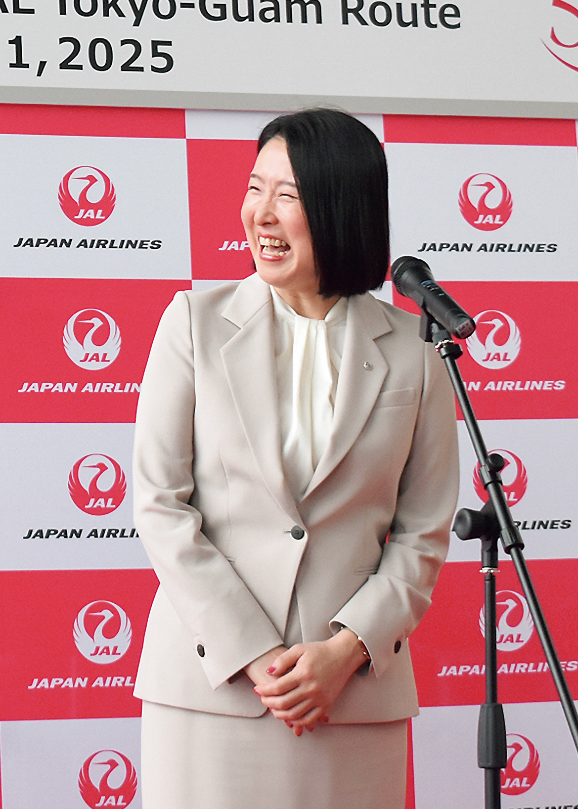 この日、成田空港で開かれた式典で、JALソリューション営業本部副本部長の西原口香織氏は、「グアムはもっとも身近な海外リゾートであり、皆様の心のなかに大事な旅の思い出として残っているのでは。また、これからグアムで新しい出会いや感動の体験をする人もいるでしょう。そのお手伝いができれば嬉しいです」と語った。