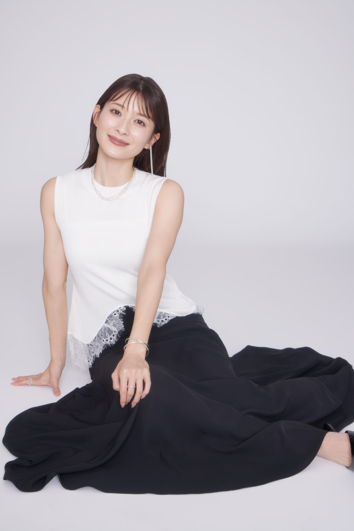 <衣装クレジット>トップス¥14,300、スカート¥18,700(ともにアニュアンス anuans.com) イヤーカフ¥13,200、ネックレス¥58,300、バングル¥45,100、左手リング¥9,900、右手リング¥11,000(すべてココシュニック オンキッチュ/ココシュニック TEL:03-4513-5140) 靴はスタイリスト私物。