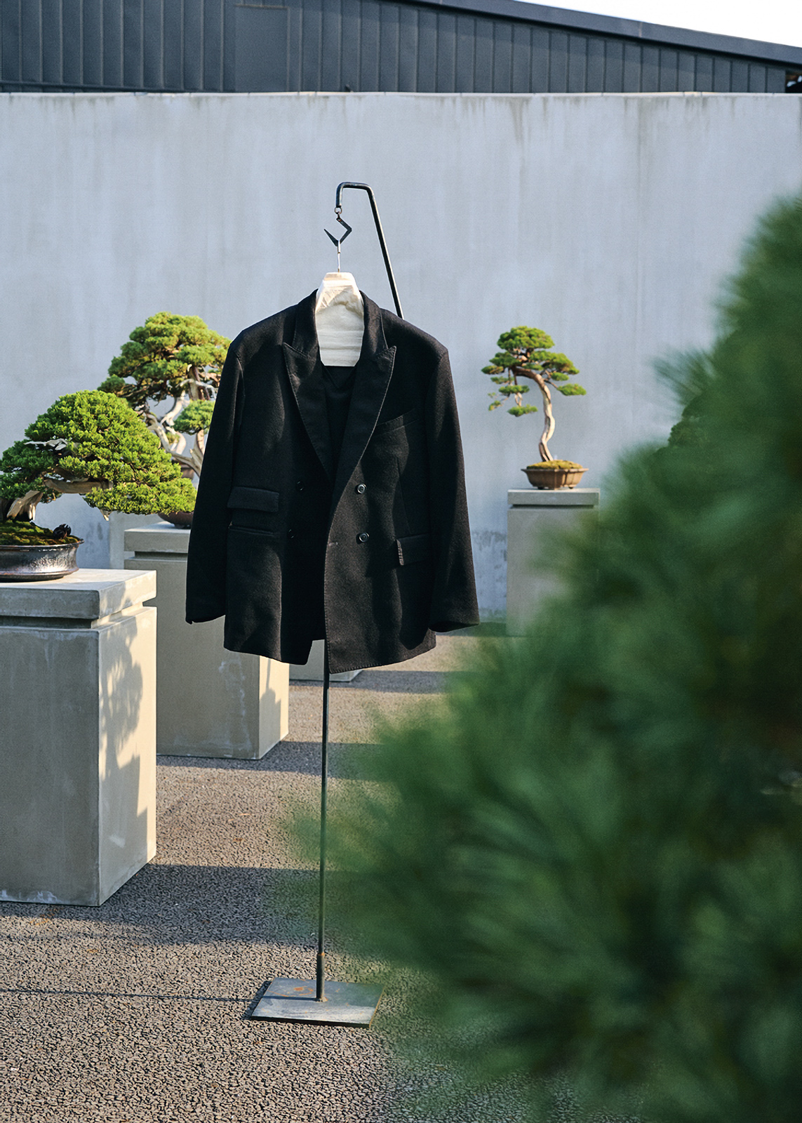 「ブランドとのコラボレーションなど盆栽を展示するイベントの場では必ず黒いジャケットを着るようにしています。主役は盆栽であり僕は黒子ですから。でもたまには、白もいいのではと髙木さんに言っていただき、落ち着いたトーンの白で仕立てていただきました」