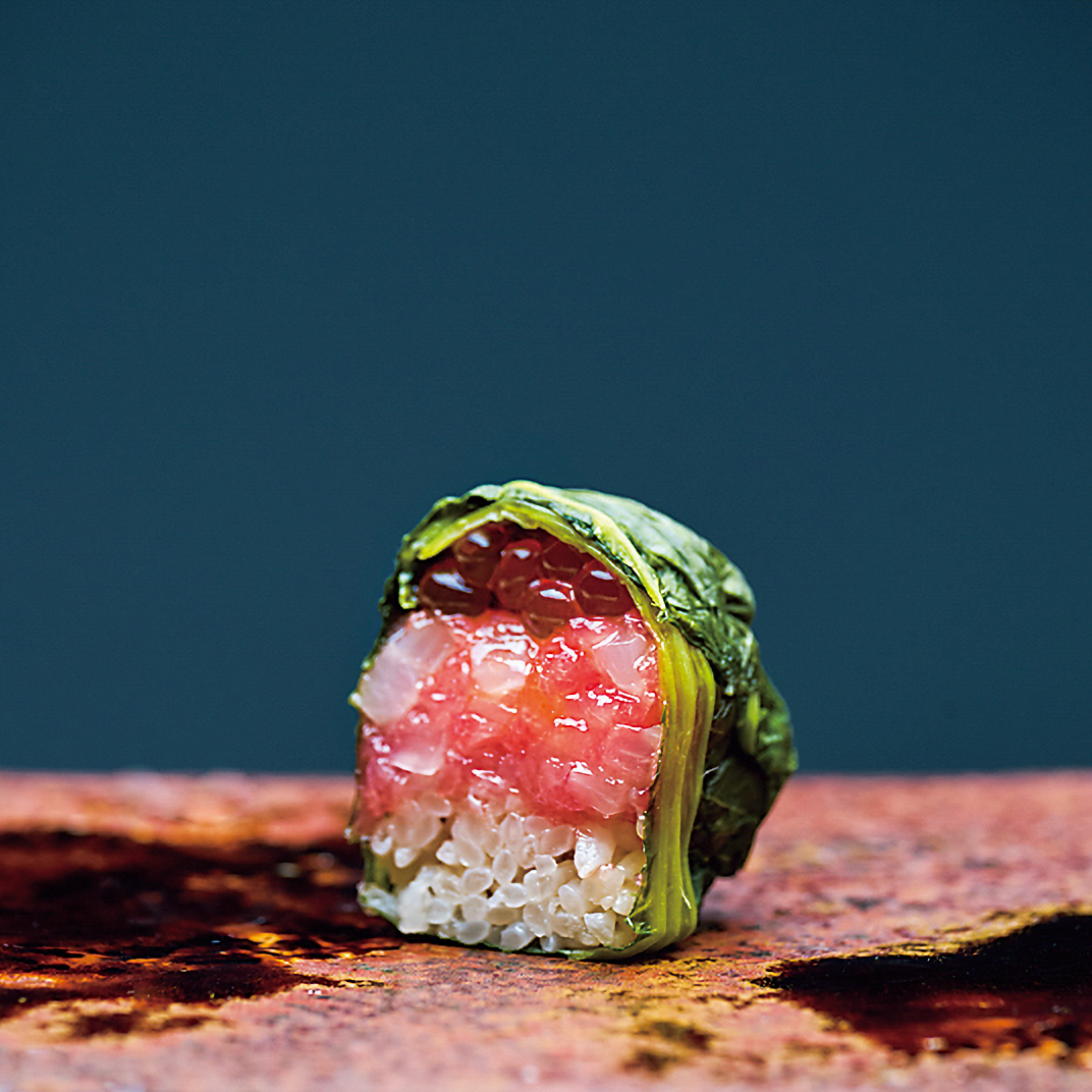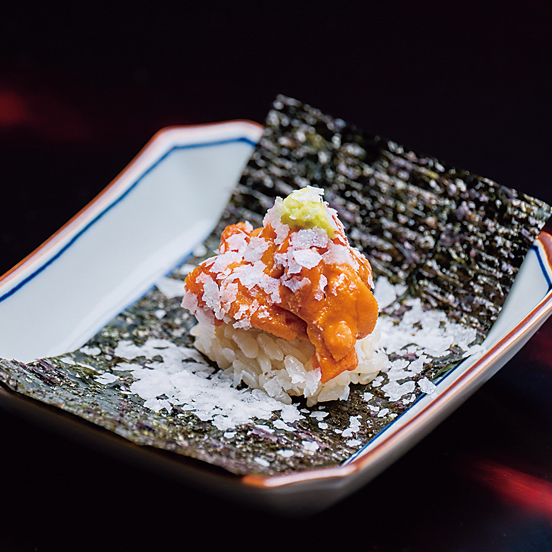 さらに握りは、「漬け」や「煮切り」「酢締め」といった江戸前鮨の伝統技法を施して魚の旨味を存分に引きだした握りのほか、和歌山の目張寿司のような日本全国の鮨文化から着想を得ながらも独創的な握りが次々と目の前に。料理長の手さばきを見ながら、その食材や調理法などのこだわりに自然と話も弾みます。そして何より嬉しいのは、常に先を読むスタッフのホスピタリティ。もはや上品な忍者のような身のこなしで、気づけばすべてが整えられているもてなし。「鮨 大手門」恐るべしです。