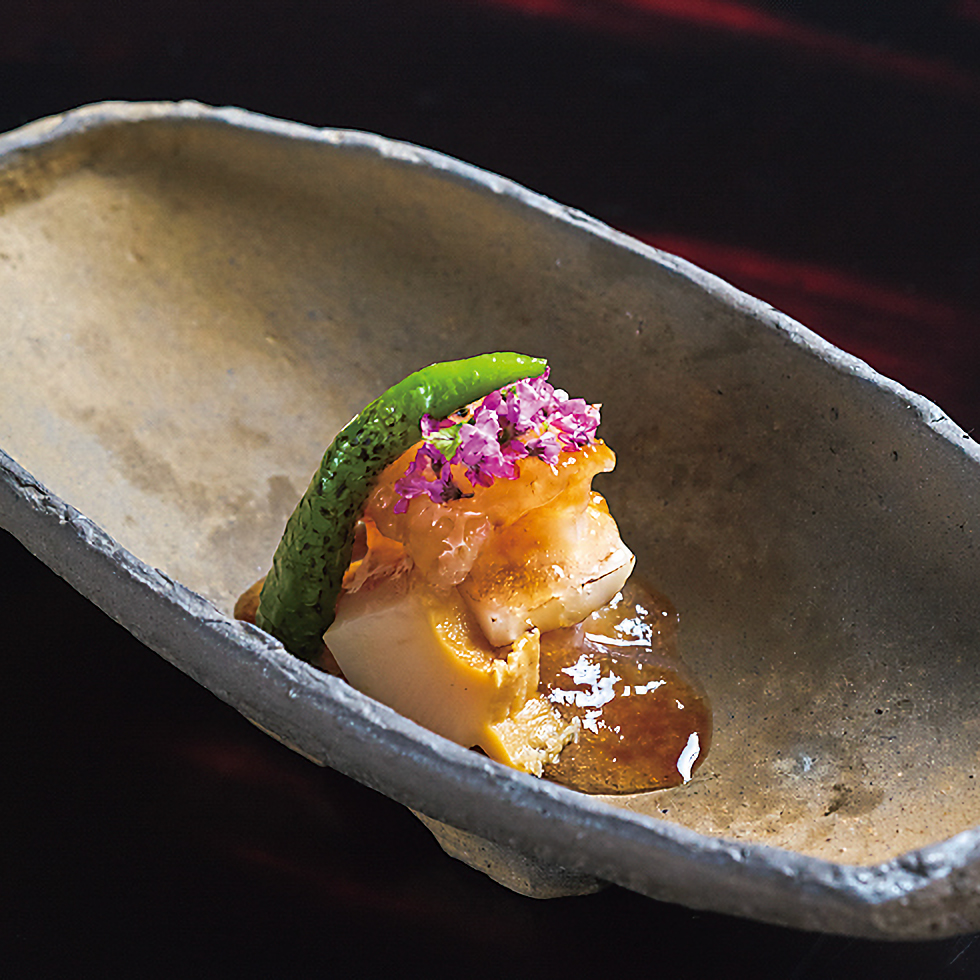 江戸時代から日本の中枢として発展してきた大手町に、本格的な日本旅館として開業したのが「星のや東京」。その中に2025年春オープンした「鮨 大手門」のおまかせコースでまず驚かされるのが、握りの前に提供される6品もの酒肴(しゃこう)です。日本料理店でその技術を培った西村将料理長による目にも麗しいひと品は、厳選した食材にひとつひとつ手間をかけ、旬を存分に感じる味わいに。