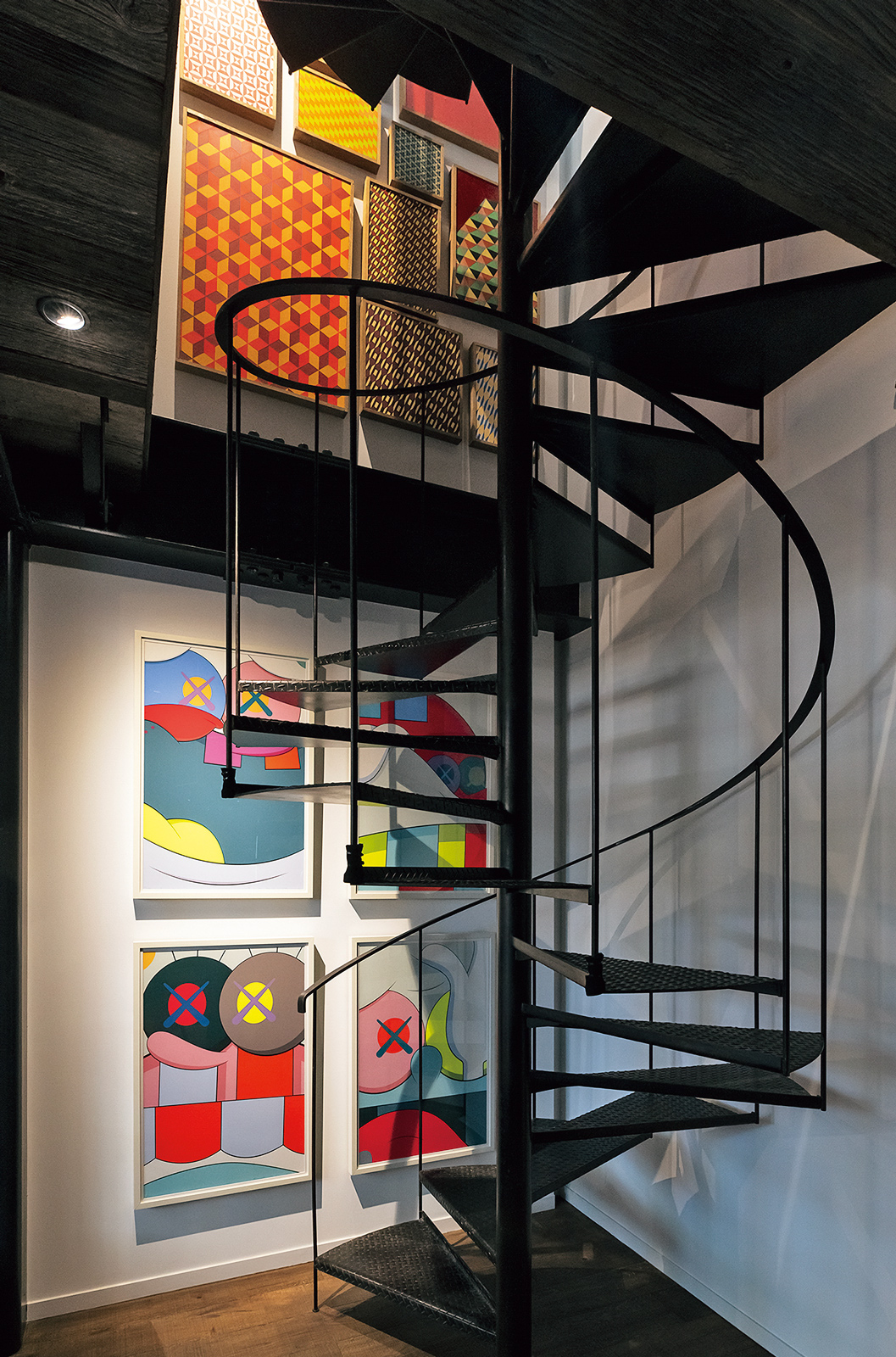 何かの倉庫と見間違えそうな建物の、漆黒に塗られた扉を開けると、そこには想像だにしなかった空間が。2階分以上吹き抜けになった高い天井の下には、磨かれた名車メルセデス・ベンツ280SLが置かれ、広い壁にはグラフィティアーティスト、バリー・マッギーのカラフルな作品が飾られている。