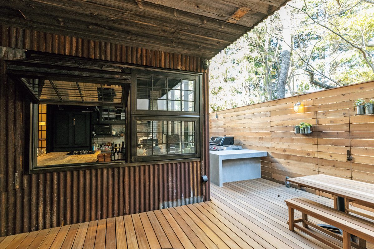 都内某所の閑静な住宅街、そのなかでも居住者しか通らないような細い道沿いに現れたのは、トタン張りの建物。実はここが「牛角」の創業者であり、現在は世界各国で「焼肉ライク」や「七宝麻辣湯」などの飲食店を500店舗以上展開するダイニングイノベーショングループファウンダー西山知義氏が手がけた別荘だ。