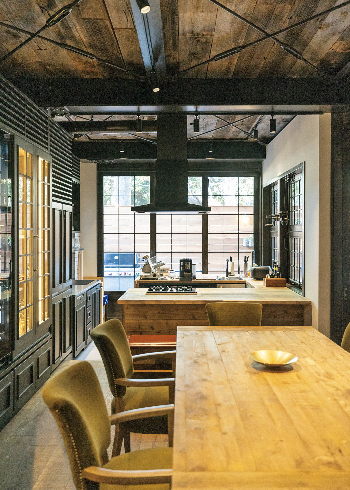 そして反対側に設えられたカウンターバーには、天井まで続く棚一面に並べられたレコードが。そんな広々とした空間は、天井や壁には味のある古材が多用され、マットブラックに塗装された梁や窓枠がアクセントとなり、完成して2ヵ月とは思えない、まるで何年も前から存在し、時を重ねたような居心地のよさを醸しだしている。