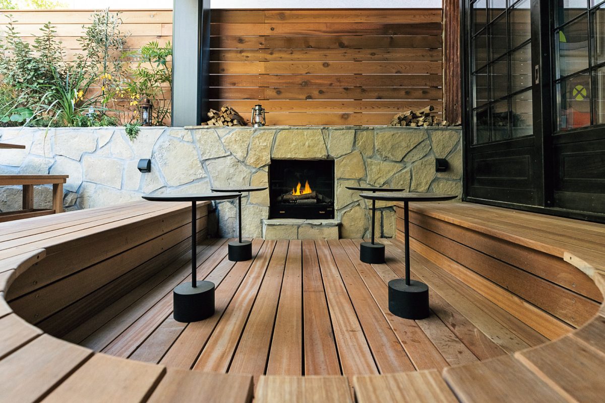 そんななか出会ったのが、都内でも広大な緑を抱く公園に隣接するこの場所だった。その環境を活かすために、建物裏手には暖炉を備えたテラスを設置。もちろん屋外キッチンも完備し、友人たちを招いてのバーベキューも楽しんでいる。