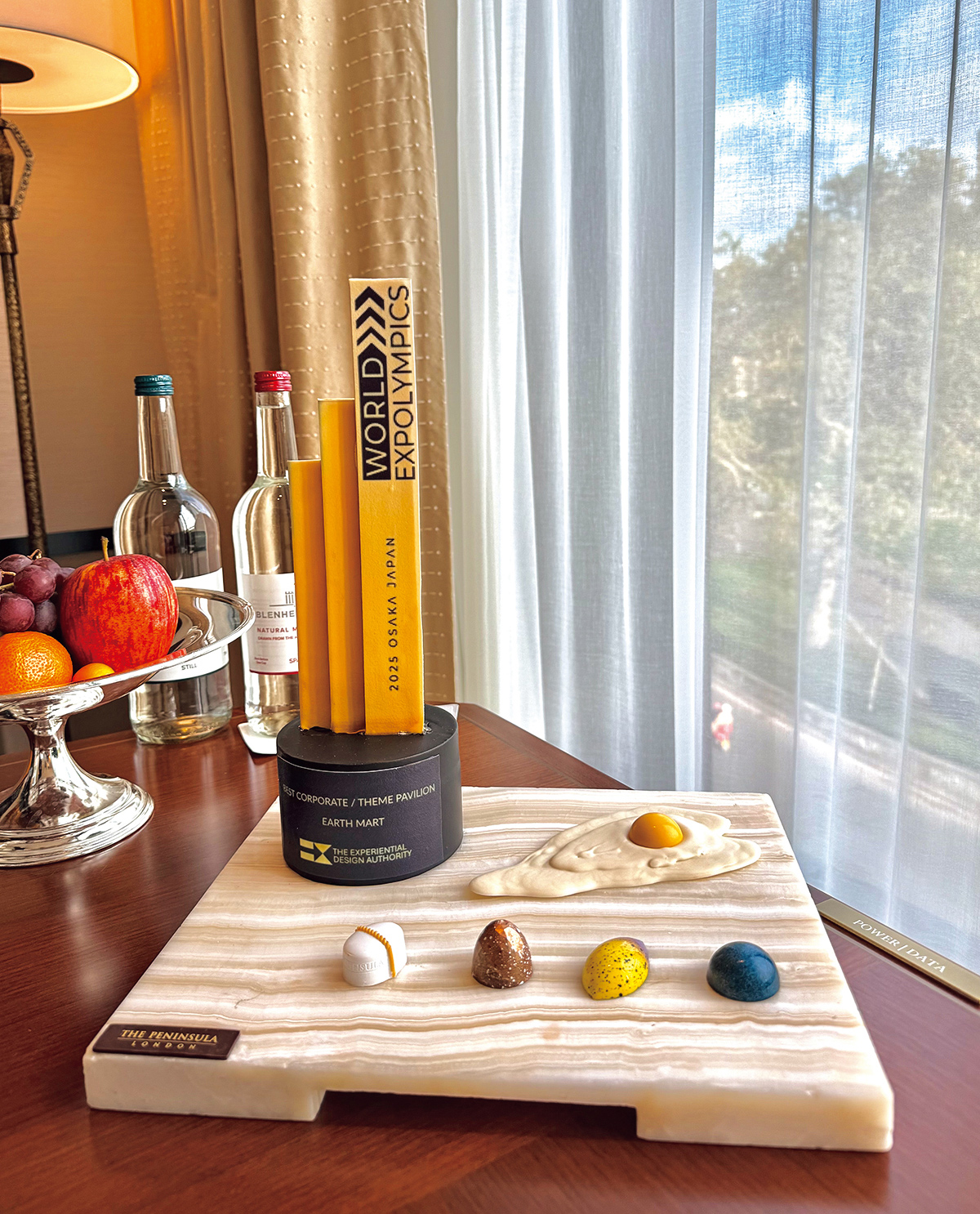 「万博でなかなか休みがなかったので、終了後、久し振りのバケーションをロンドンで取りました。2023年に開業したザ・ペニンシュラロンドンに泊まりたかったからです。ロンドンに到着して部屋に入ったら、テーブルの上に見たことがあるものがあって。それはチョコレートで作られた、あのトロフィーだったんです。ホテルが用意してくれた嬉しいサプライズ。感動しましたね」